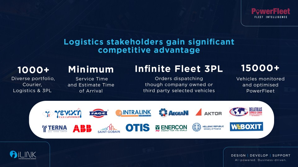 Το PowerFleet υποστηρίζει εταιρείες logistics και courier με real-time παρακολούθηση οχημάτων, βελτιστοποίηση δρομολογίων, proof of delivery και SLA monitoring.