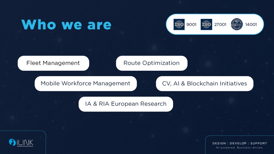 Με έμφαση στη βιωσιμότητα, την ασφάλεια και τις data-driven αποφάσεις, η iLink λειτουργεί ως στρατηγικός τεχνολογικός συνεργάτης για τους πελάτες της. Στόχος μας είναι να μετατρέπουμε τα δεδομένα κινητικότητας σε επιχειρησιακή αξία, ενισχύοντας τη μακροπρόθεσμη ανάπτυξη και την ανταγωνιστικότητα σε κάθε κλάδο δραστηριότητας.