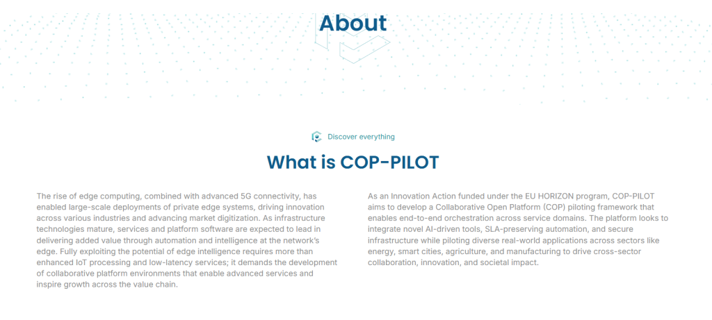 Το COP-PILOT (HORIZON IA) αναπτύσσει ανοικτή πλατφόρμα που ενορχηστρώνει υπηρεσίες σε IoT και Edge περιβάλλοντα.